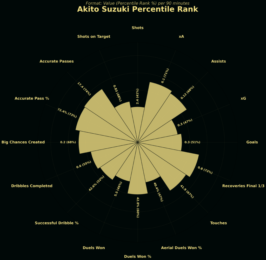The first is his pressing ability. Akito Suzuki never stops pressing. He constantly harries center-backs, closes passing lanes, and applies pressure with real intent rather than symbolic effort. His aggression forces defenders into rushed decisions, often pushing them into long balls or low-percentage passes. He is excellent at winning duels and loose balls, and his activity level results in an unusually high number of ball recoveries in the final third, making him one of the most disruptive forwards off the ball in his league.