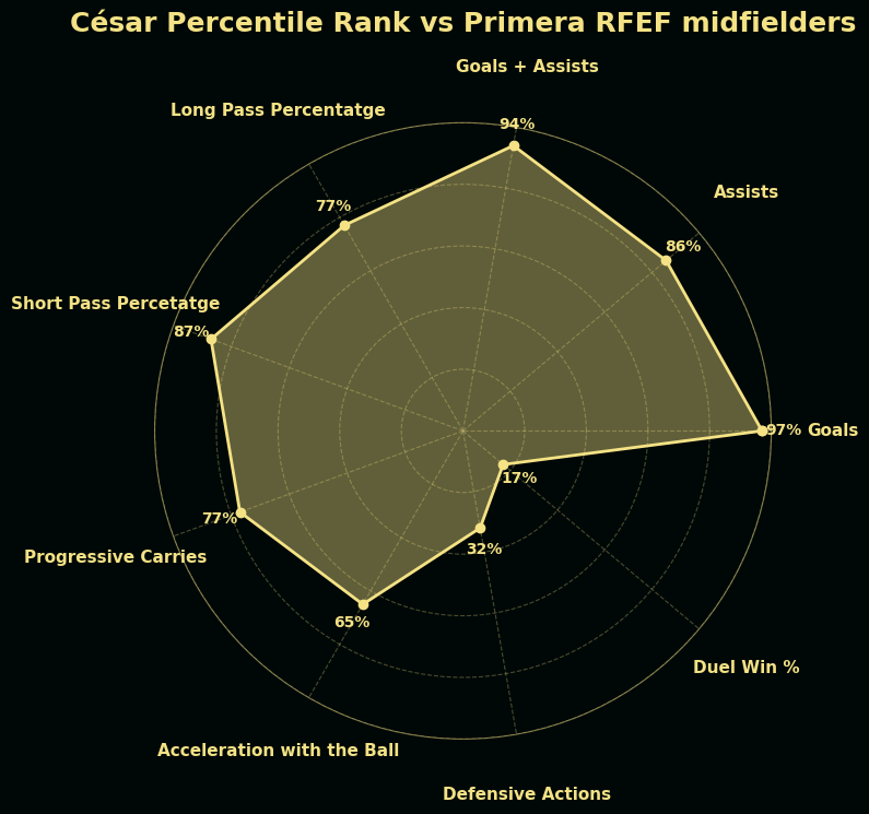 The radar plot only confirms what has been said earlier: César is an offensive powerhouse that needs to improve in concentration, implication and agression.