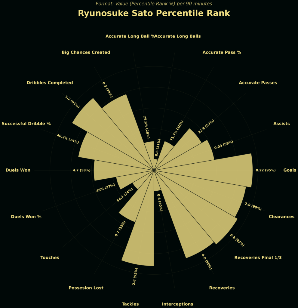 For all of Sato’s promise, there are still aspects of his game that require refinement before he can be considered among the elite young playmakers in Asia or beyond. Most notably, his final third execution — particularly in terms of finishing power and creative end product — remains inconsistent. While his involvement and progressive actions are exciting, the transition from possession to meaningful goal contributions needs to become more reliable.